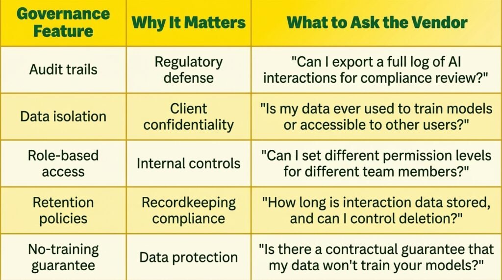 Your client data must remain in your controlled environment. It must not train external models. Therefore, demand written confirmation of data isolation before onboarding any vendor.