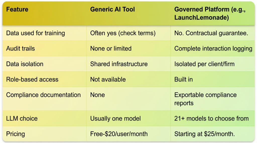 Generic AI tools target broad consumer use. Therefore, they often lack governance controls, audit exports, and contractual data guarantees. In contrast, launchlemonade builds compliance features into its core architecture.