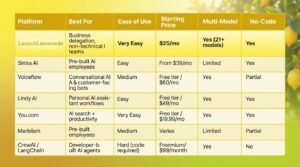 • For non-technical users, LaunchLemonade and Lindy AI are the most accessible options. Both offer no-code setup where you describe what you need in plain English. LaunchLemonade focuses on business task delegation with multi-model AI, while Lindy focuses on personal productivity automation.