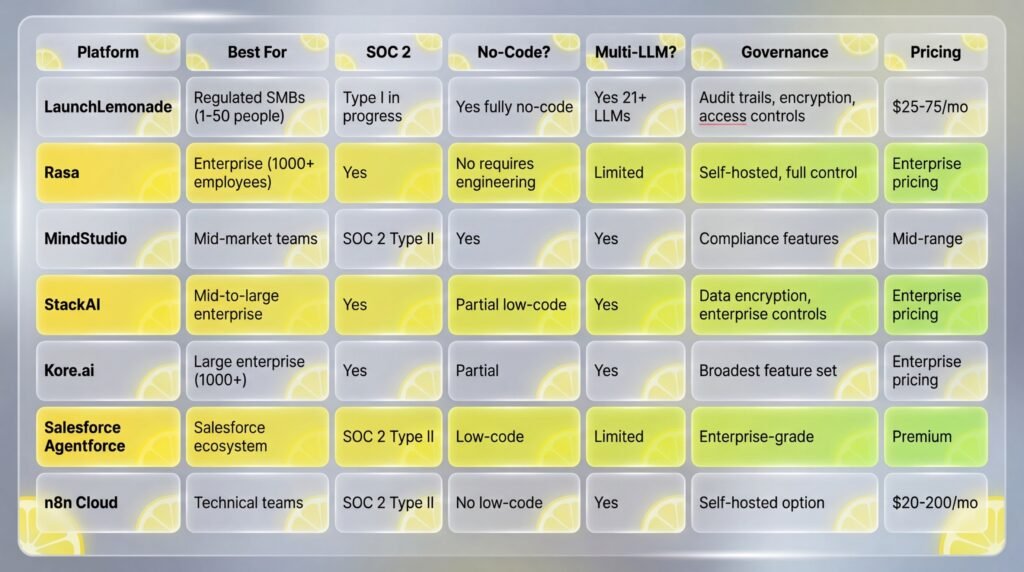 The best AI agent builder for regulated industries depends on your team size and technical resources. For regulated SMBs (financial advisors, accounting firms, consultants) who need governance without a dev team, the right platform matters more than the biggest brand name. For enterprises with engineering teams who need self-hosted deployment, Rasa leads. For mid-market with technical staff, StackAI and MindStudio are strong options. Here’s how to evaluate them.
