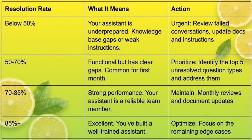 Resolution rate measures the percentage of conversations your AI assistant handles completely without needing human follow-up. It’s the single most important metric for understanding whether your assistant is actually doing its job.
