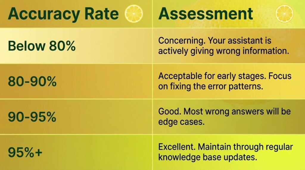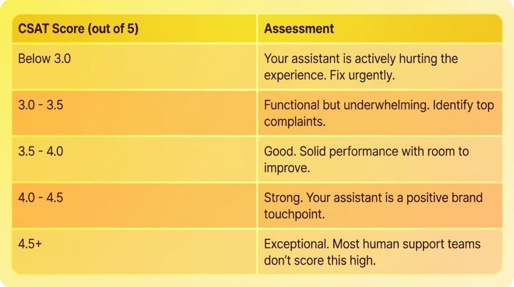 The same five metrics apply, just adjusted. Resolution rate becomes “task completion rate.” Accuracy measures whether the information provided was correct. Time saved is often even easier to measure for internal use because team members can directly report it. CSAT becomes an internal team satisfaction survey (monthly is sufficient). The target benchmarks are the same.