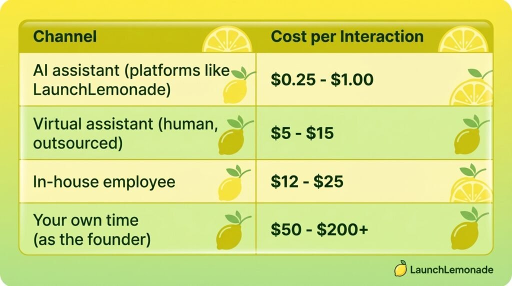 The math gets more dramatic at scale. If your assistant handles 400 interactions per month at $0.56 each versus you handling them at $75/hour (8 minutes each), that’s $224 versus $4,000. A 94% cost reduction.