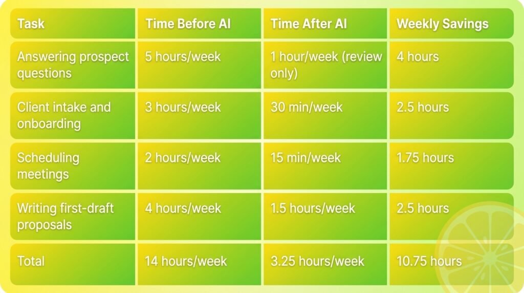 Most well-configured AI assistants save business owners 5-15 hours per week on tasks like answering repetitive questions, handling intake, and preparing documents. But you need to measure YOUR actual savings, not just trust the average.