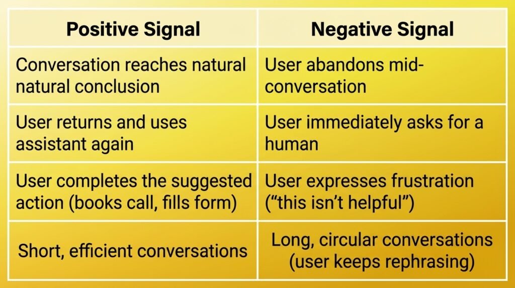 Add a simple “Was this helpful? Rate 1-5” prompt at the end of each conversation. This is the most common approach and gives you the most data.