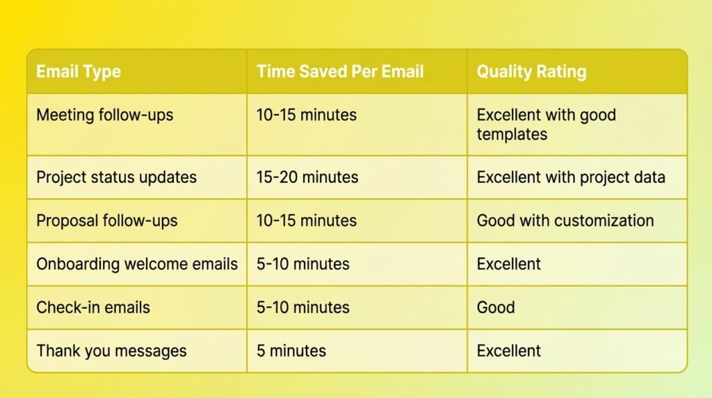 AI is strongest at drafting structured, repeatable email types. Here are the categories where it saves the most time.