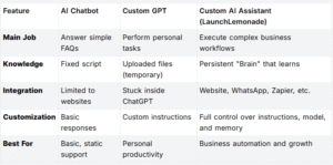 Custom GPTs are brilliant because they’re no-code and accessible. Anyone can create one. But like attachments, they’re tied to the same kitchen. They only work inside the ChatGPT platform. You can’t embed them on your website, plug them into WhatsApp, or use them across your business workflows. They’re handy gadgets, not enterprise-grade tools.